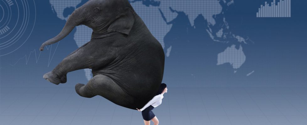 Portrait,Of,Businesswoman,Lifting,Heavy,Elephant,Over,World,Map